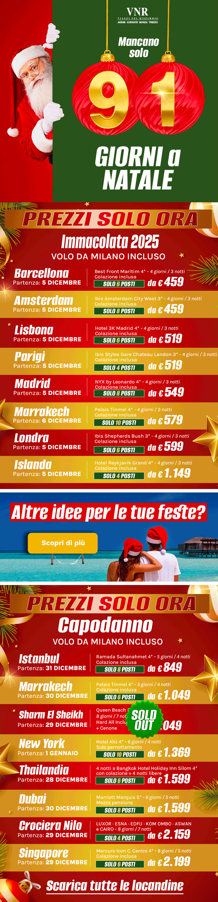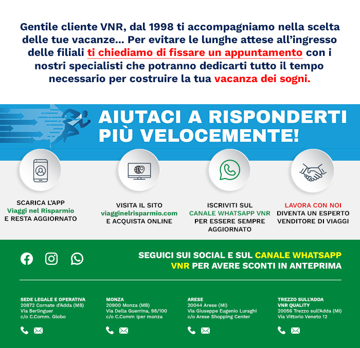 ATTENZIONE: Questa email ed i suoi eventuali allegati contengono informazioni confidenziali indirizzate solamente agli indirizzi di posta selezionati. Le informazioni contenute non dovranno essere dunque divulgate in ottemperanza con le leggi vigenti. Qualora questa email raggiunga un destinatario sconosciuto si prega di comunicare l'errore al seguente indirizzo: cornate@viagginelrisparmio.com. Se non vuoi più ricevere questa newsletter Clicca qui