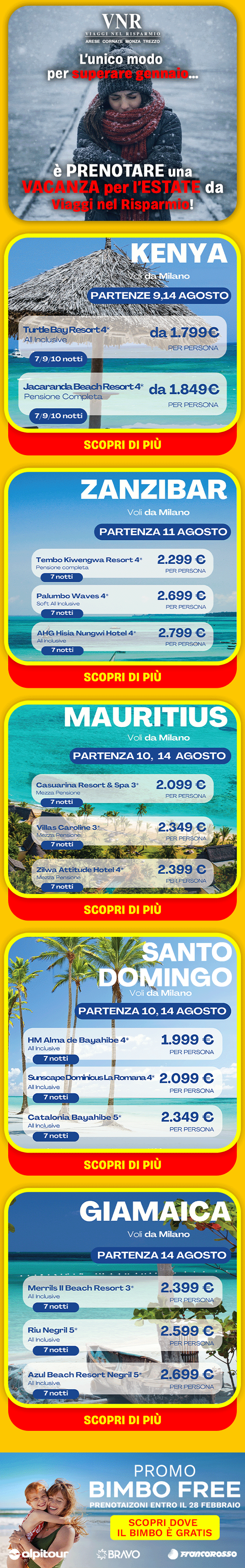 ATTENZIONE: Questa email ed i suoi eventuali allegati contengono informazioni confidenziali indirizzate solamente agli indirizzi di posta selezionati. Le informazioni contenute non dovranno essere dunque divulgate in ottemperanza con le leggi vigenti. Qualora questa email raggiunga un destinatario sconosciuto si prega di comunicare l'errore al seguente indirizzo: cornate@viagginelrisparmio.com. Se non vuoi più ricevere questa newsletter Clicca qui