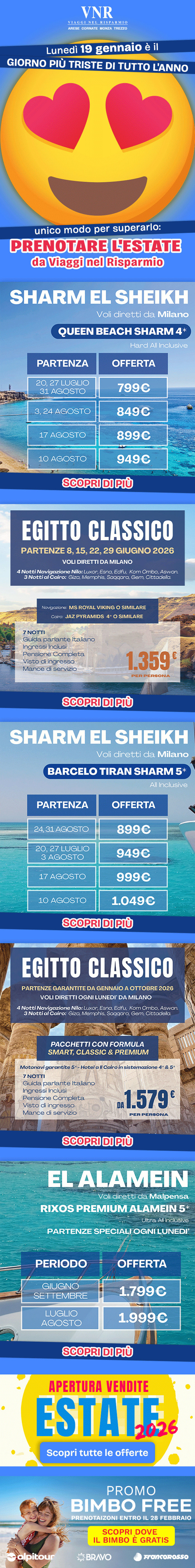 ATTENZIONE: Questa email ed i suoi eventuali allegati contengono informazioni confidenziali indirizzate solamente agli indirizzi di posta selezionati. Le informazioni contenute non dovranno essere dunque divulgate in ottemperanza con le leggi vigenti. Qualora questa email raggiunga un destinatario sconosciuto si prega di comunicare l'errore al seguente indirizzo: cornate@viagginelrisparmio.com. Se non vuoi più ricevere questa newsletter Clicca qui