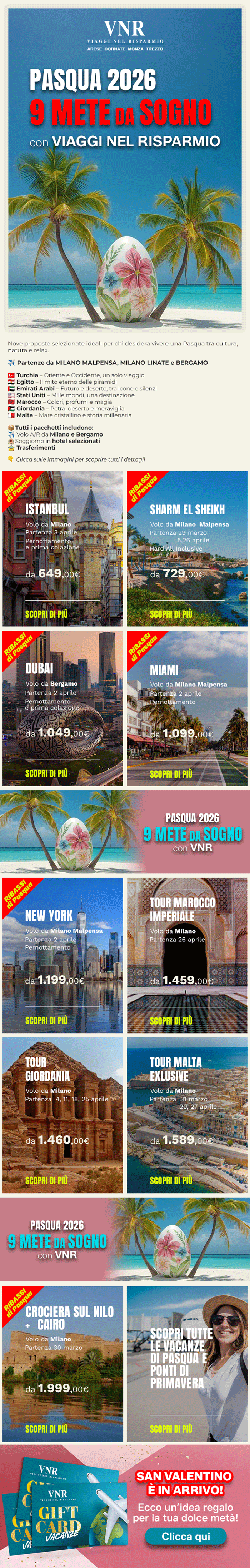 ATTENZIONE: Questa email ed i suoi eventuali allegati contengono informazioni confidenziali indirizzate solamente agli indirizzi di posta selezionati. Le informazioni contenute non dovranno essere dunque divulgate in ottemperanza con le leggi vigenti. Qualora questa email raggiunga un destinatario sconosciuto si prega di comunicare l'errore al seguente indirizzo: cornate@viagginelrisparmio.com. Se non vuoi più ricevere questa newsletter Clicca qui