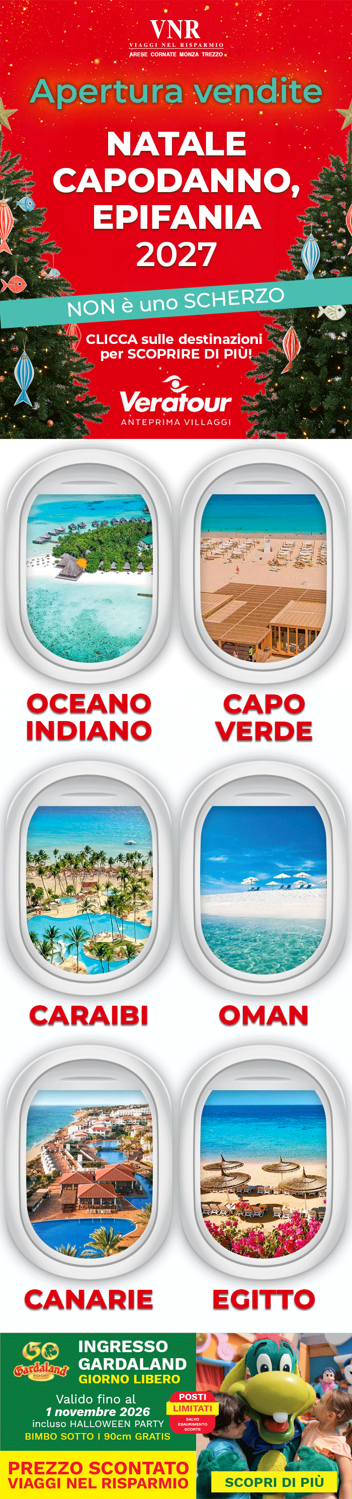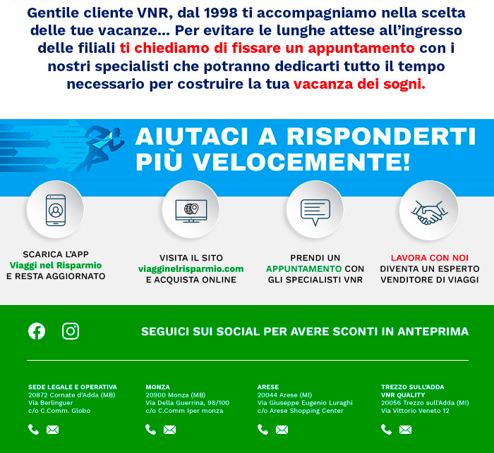 ATTENZIONE: Questa email ed i suoi eventuali allegati contengono informazioni confidenziali indirizzate solamente agli indirizzi di posta selezionati. Le informazioni contenute non dovranno essere dunque divulgate in ottemperanza con le leggi vigenti. Qualora questa email raggiunga un destinatario sconosciuto si prega di comunicare l'errore al seguente indirizzo: cornate@viagginelrisparmio.com. Se non vuoi più ricevere questa newsletter Clicca qui